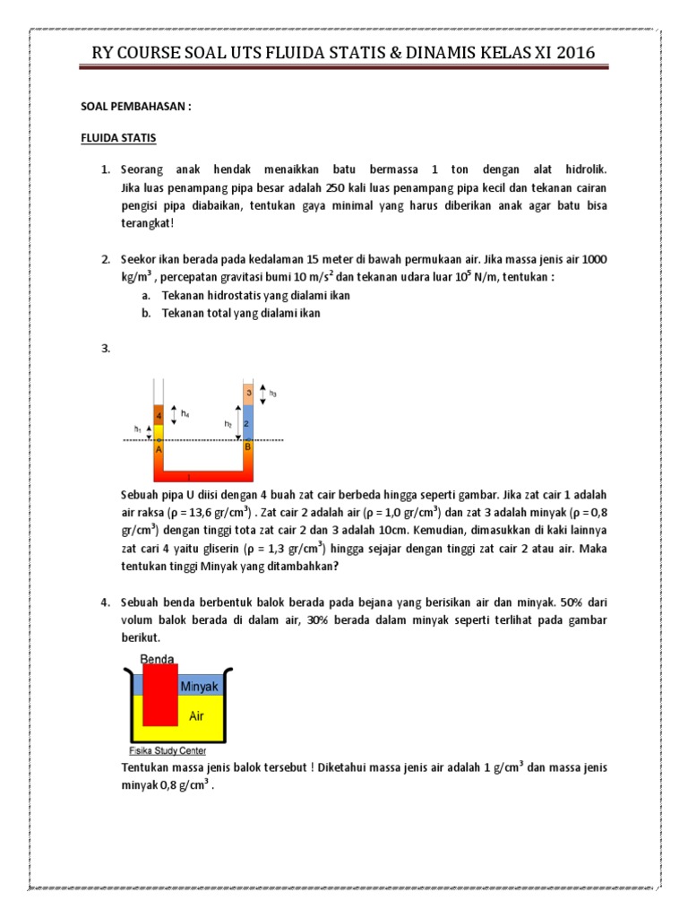 Contoh soal dan pembahasan tentang fluida statis, materi fisika kelas 2 sma. Berikut ini terdapat beberapa contoh soal fluida statis, terdiri atas: Untuk itu gerakan dari fluida dinamis ini memiliki tujuan tertentu. Latihan soal dan pembahasan fluida statis soal dan pembahasan fluida statis sub bab. Seekor ikan berada pada kedalaman 15 meter di bawah permukaan air.